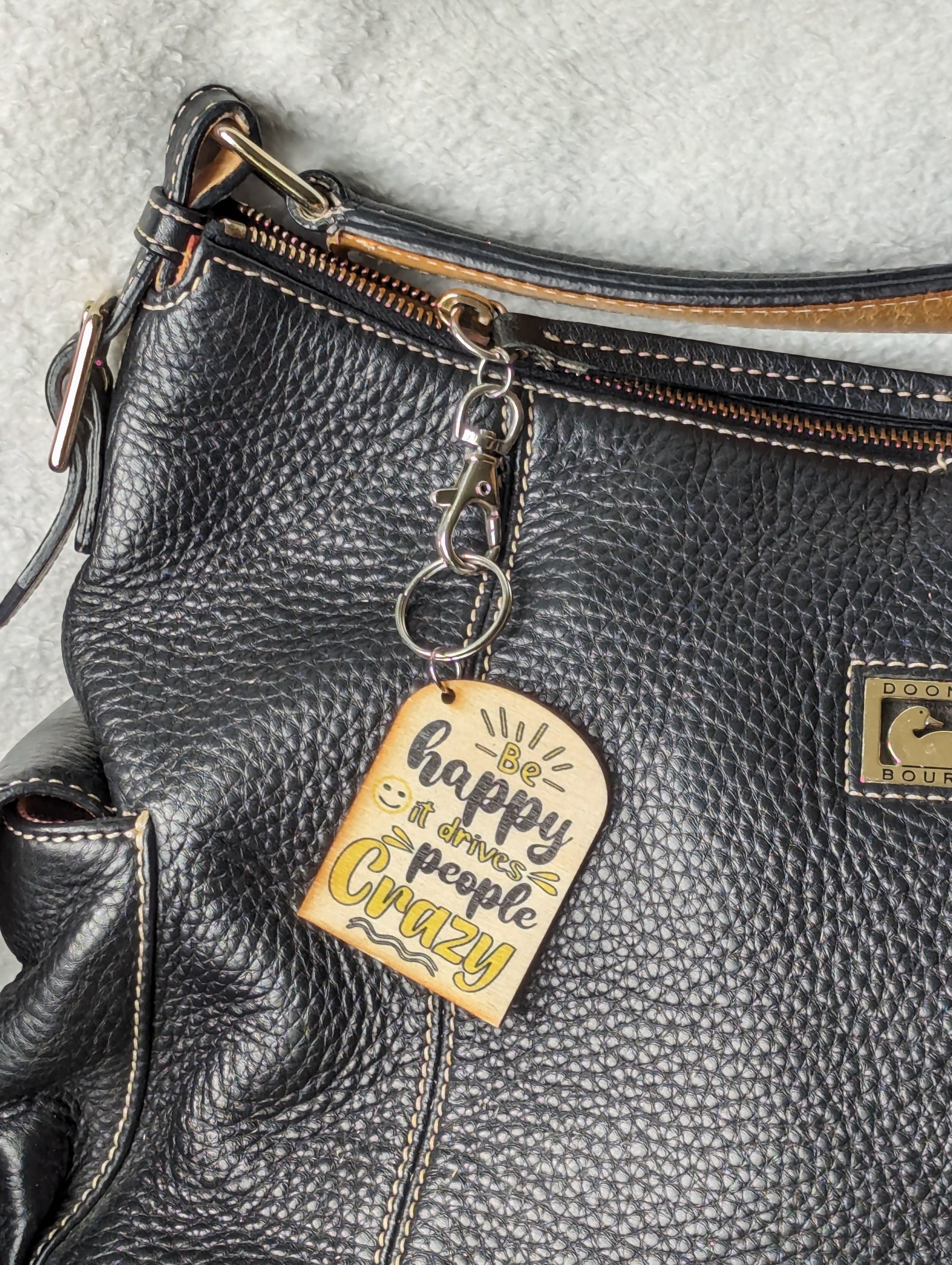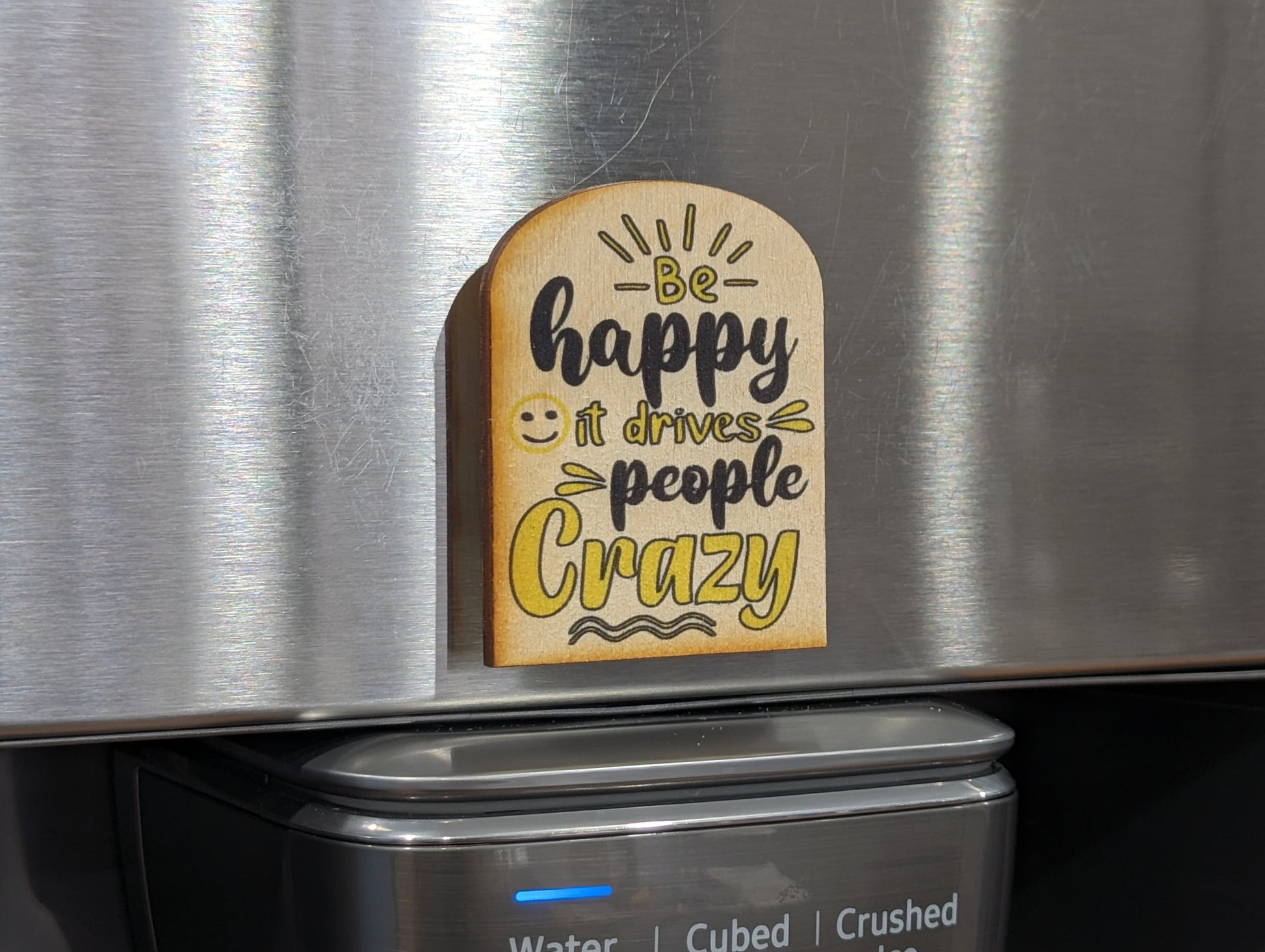 Humorous Cute Colorful Printed Birchwood Yellow Keychain Keys Gift Kitchen Magnet Refrigerator USA Made Be Happy It Drives People Crazy