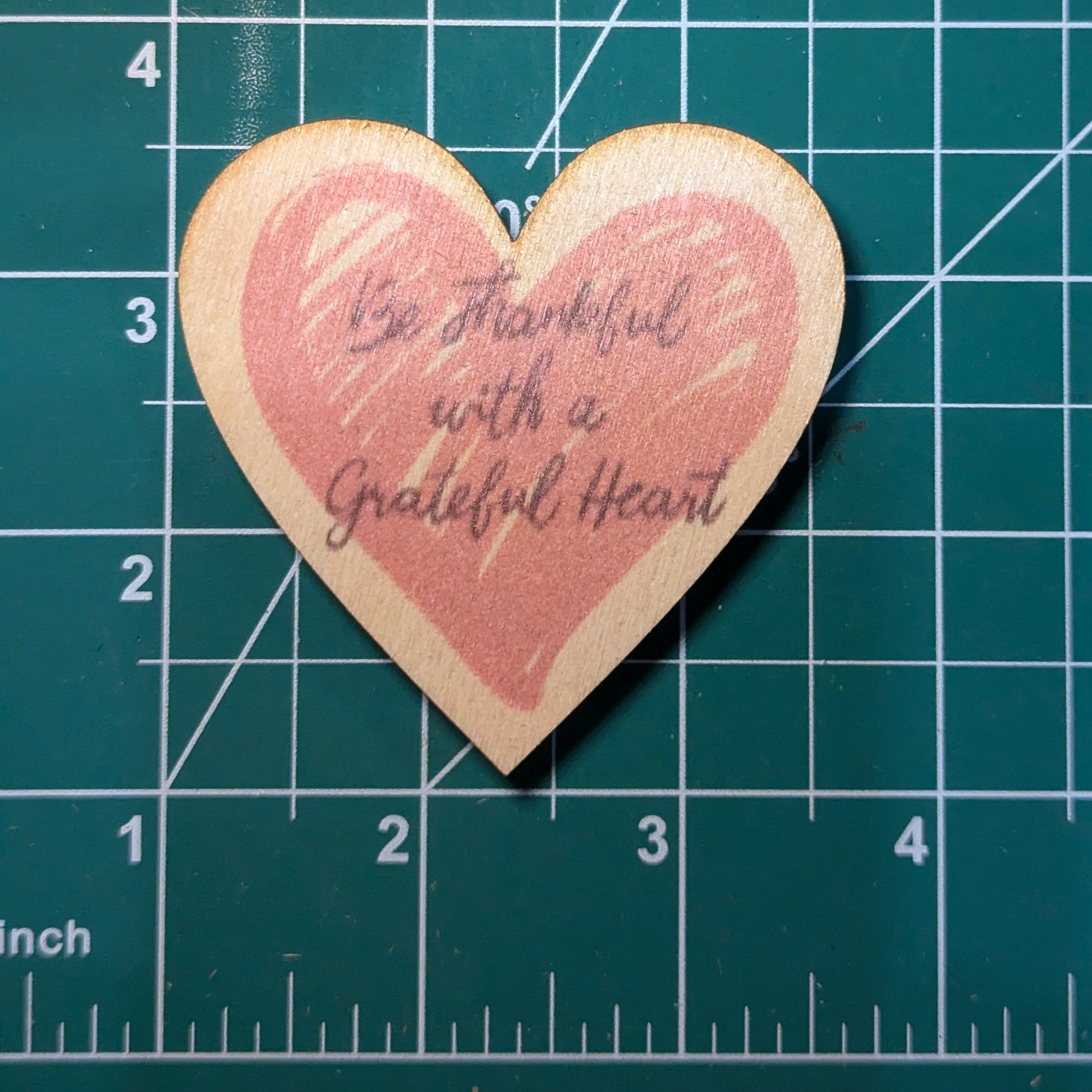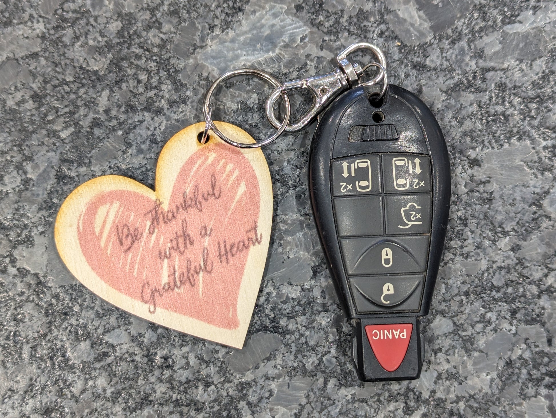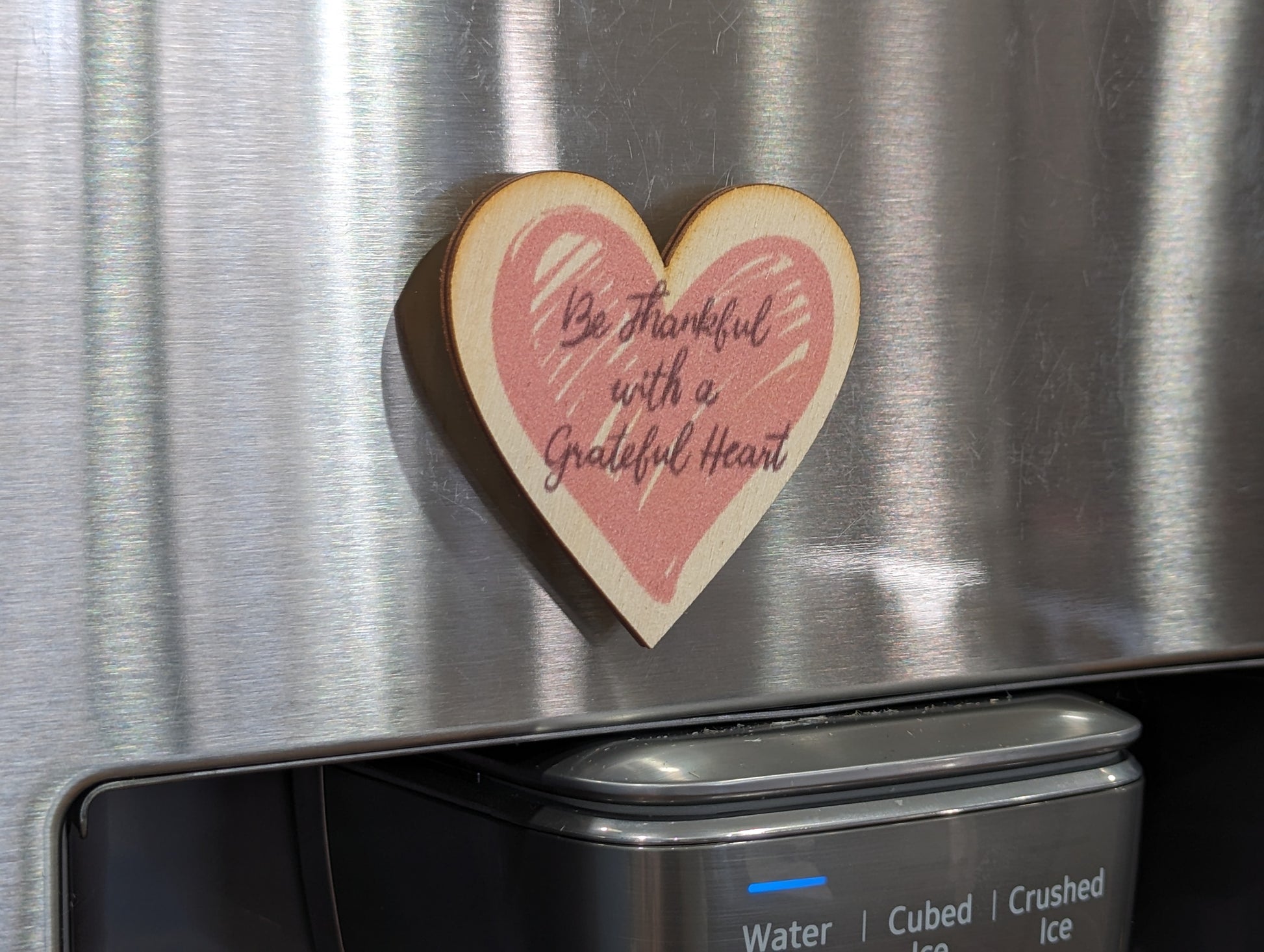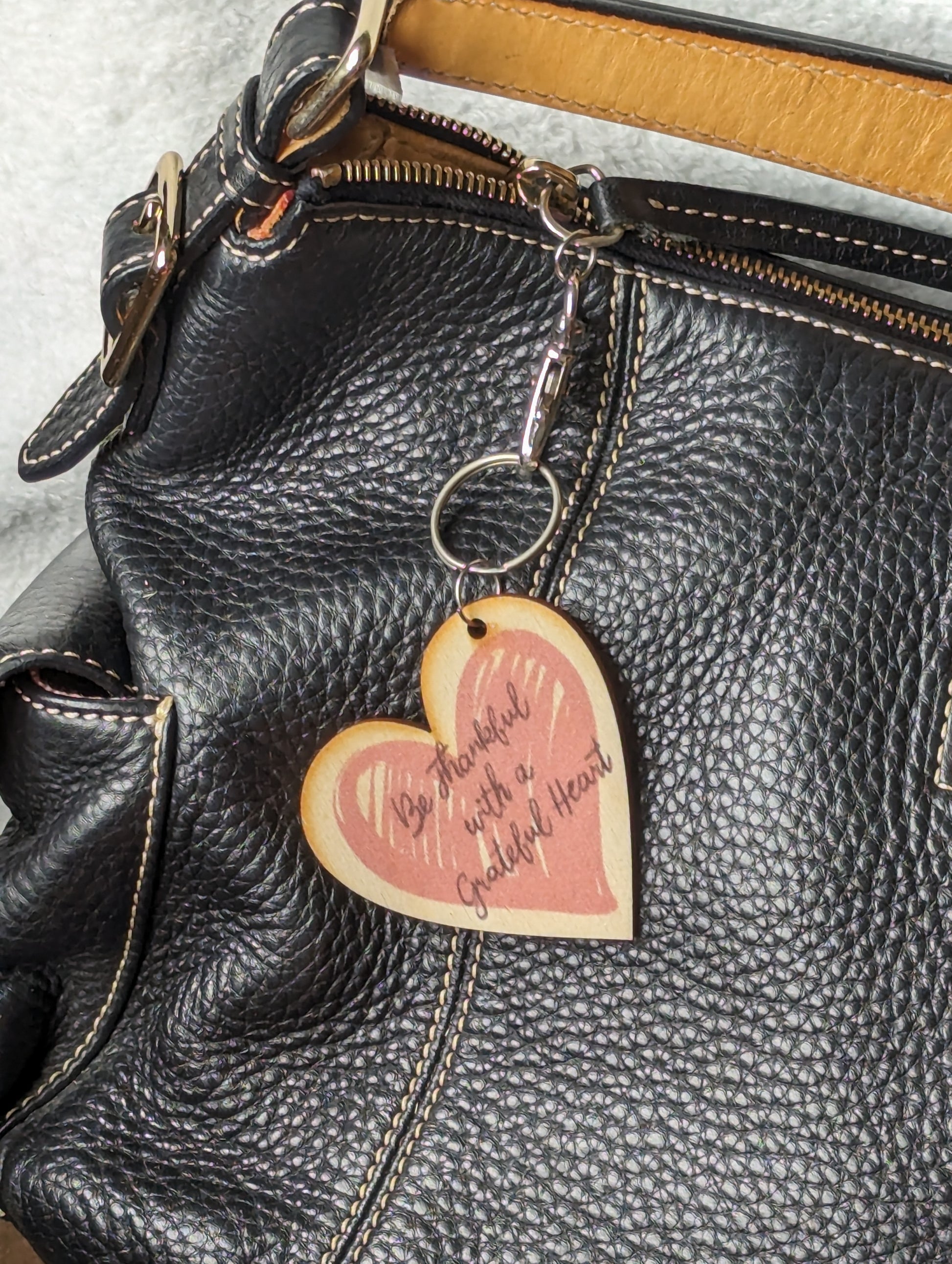 Cute Heart Shaped Keychain Printed Birchwood Thank You Gift Reminder Pink Filing Cabinet Magnet Refrigerator USA Made Be Thankful With A Grateful Heart