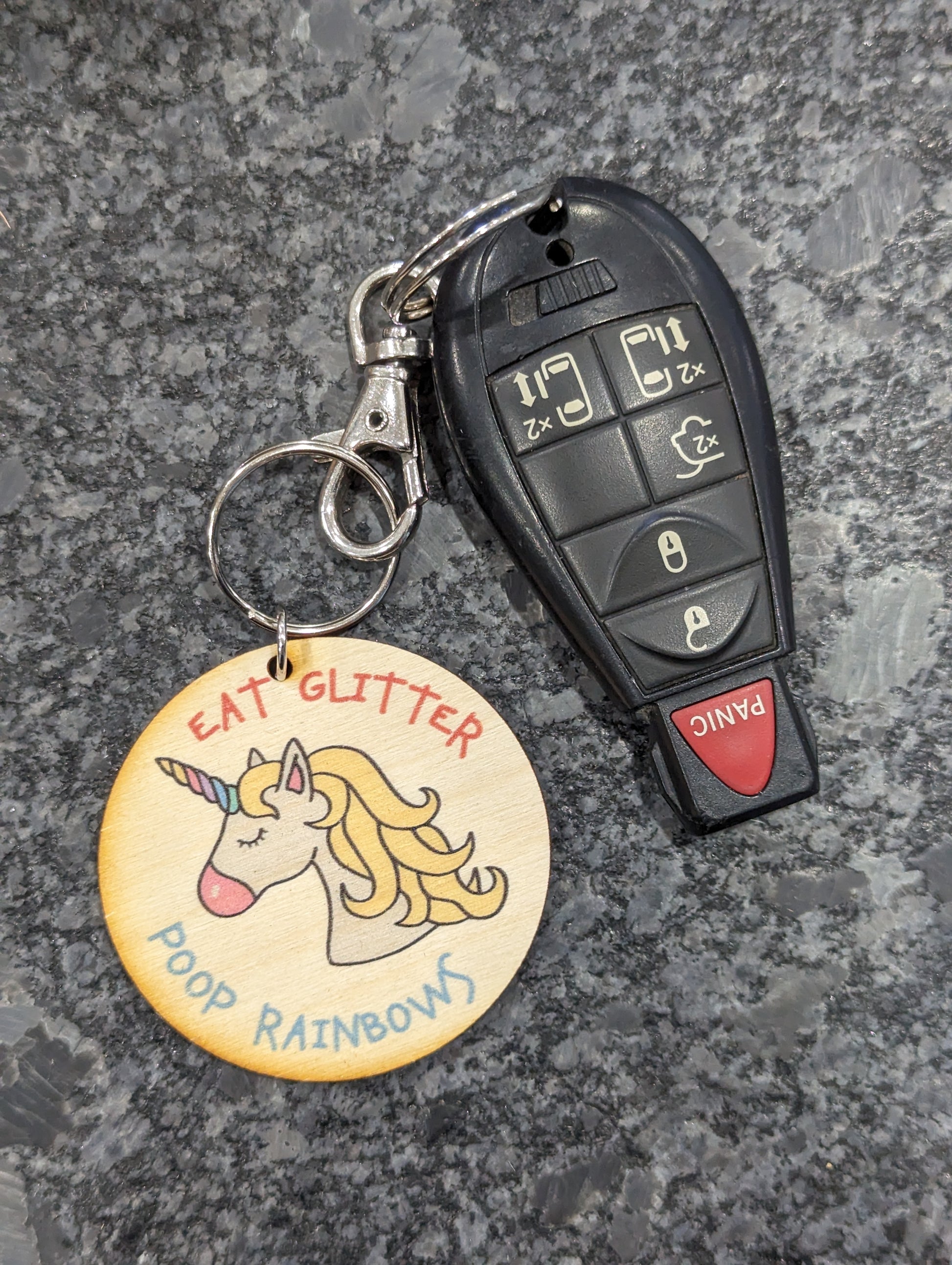 Adorable Colorful Quirky Printed Birchwood Keychain Keys Gift Kitchen Magnet Refrigerator Friend Backpack Fun USA Made Eat Glitter Poop Rainbows