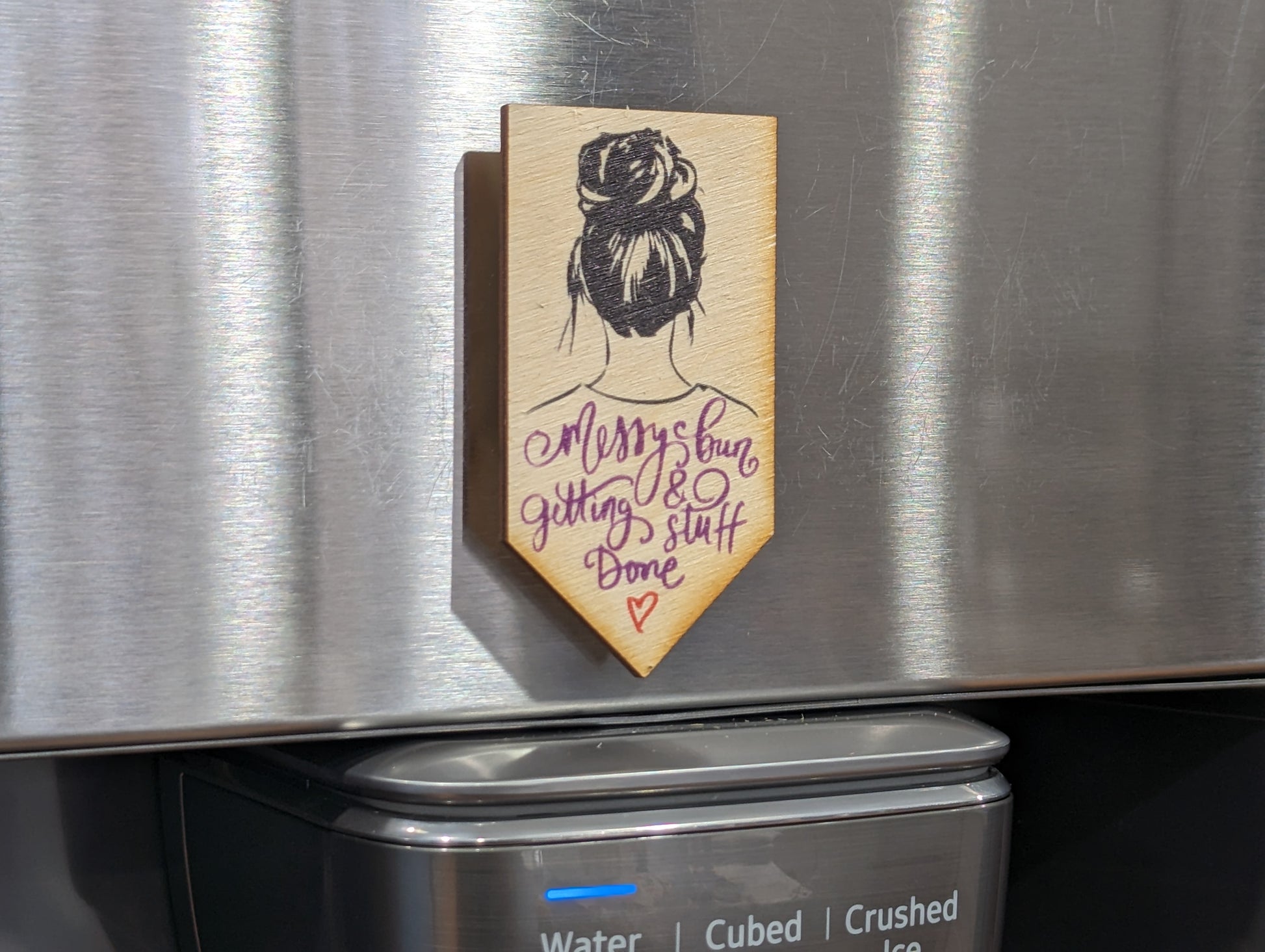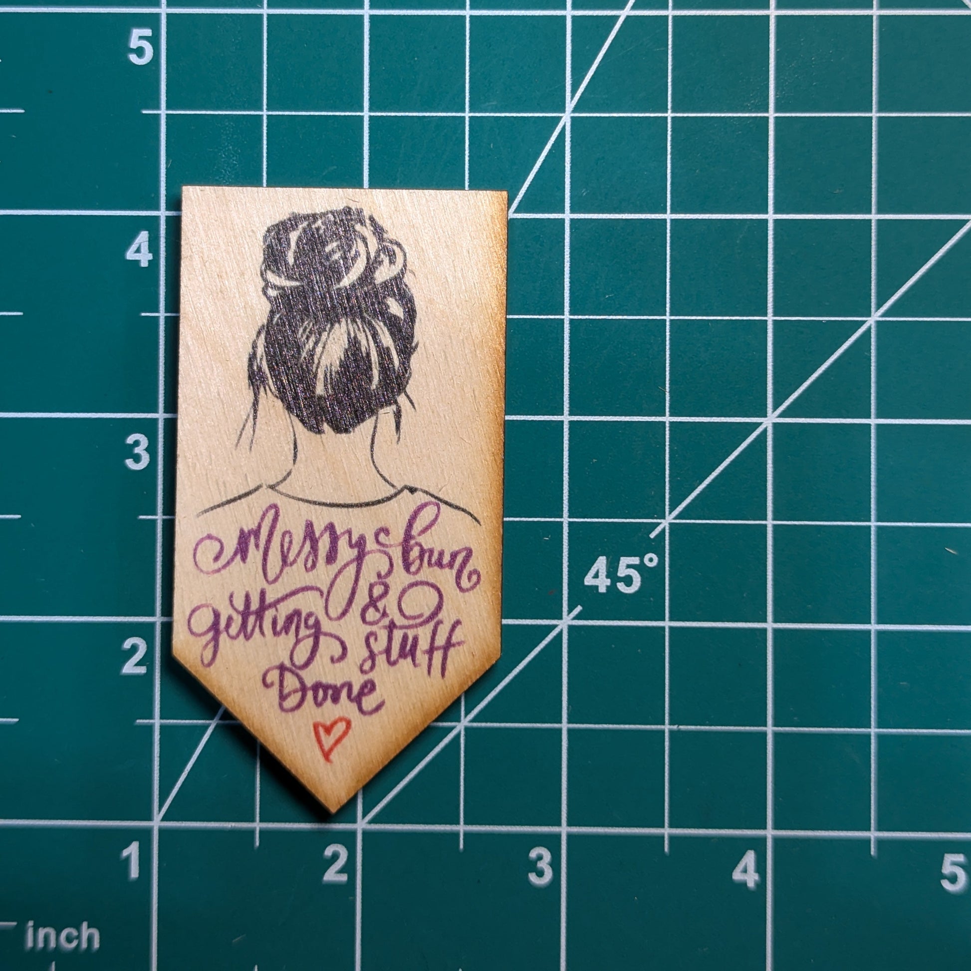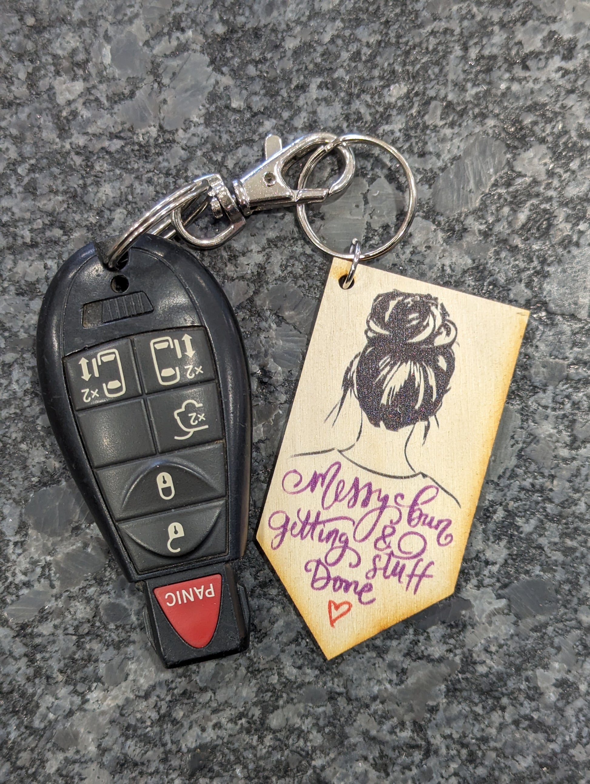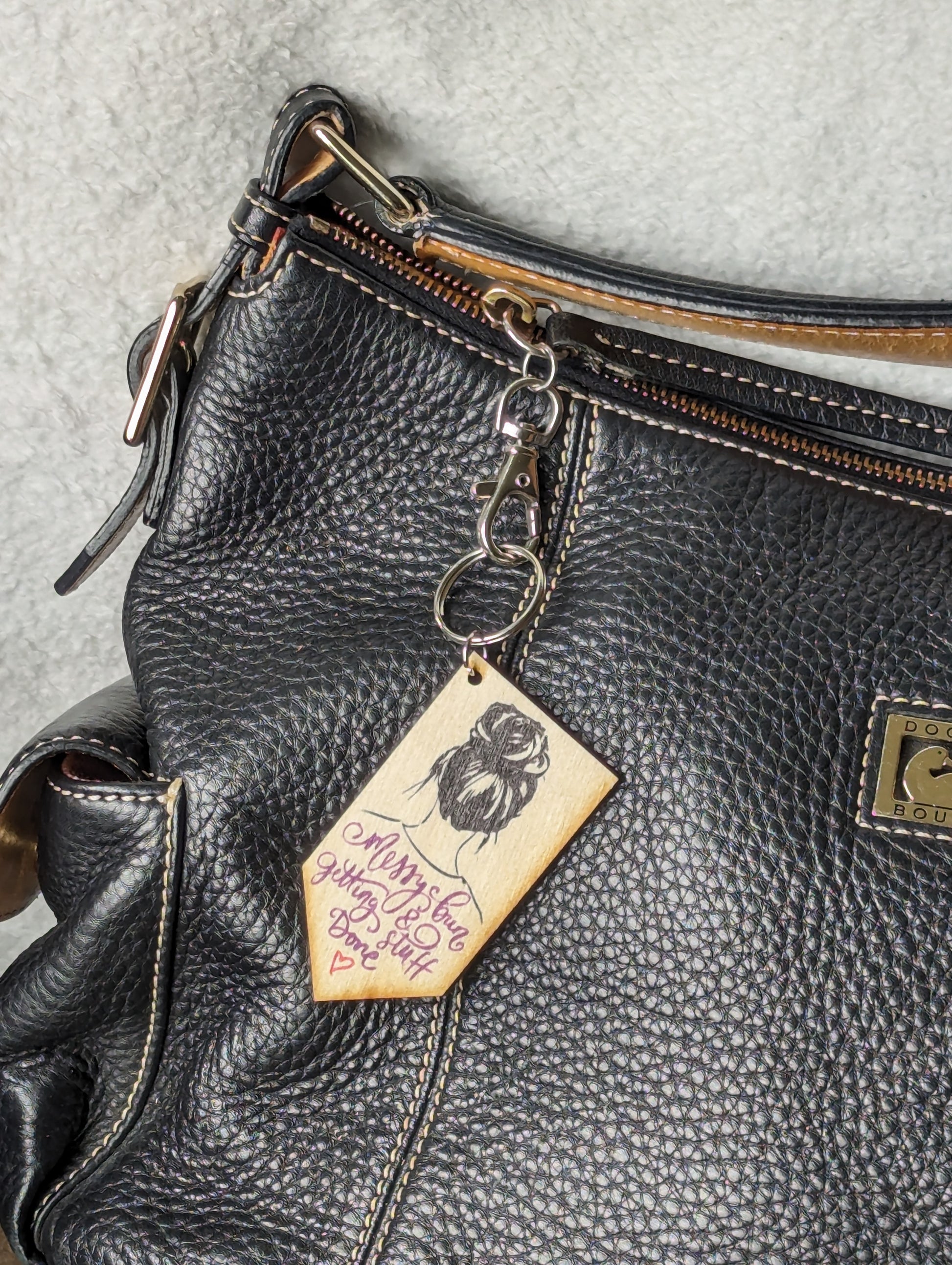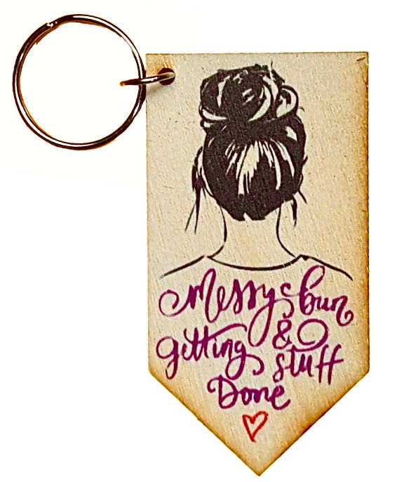 Quirky Cute Colorful Printed Birchwood Keychain Keys Mom Gift Kitchen Magnet Refrigerator Friend Workspace Fun USA Made Mother's Day Messy Bun And Getting Stuff Done