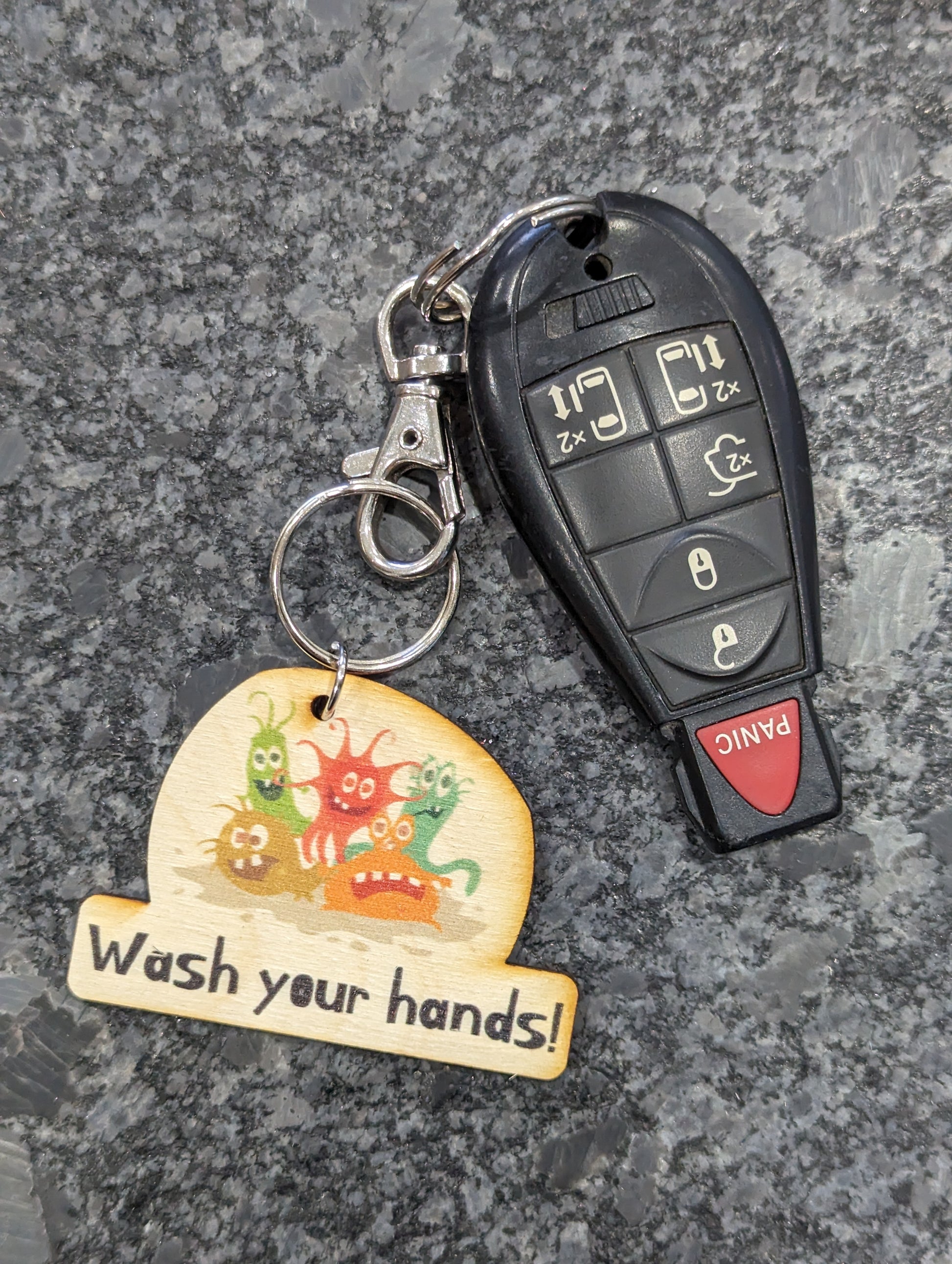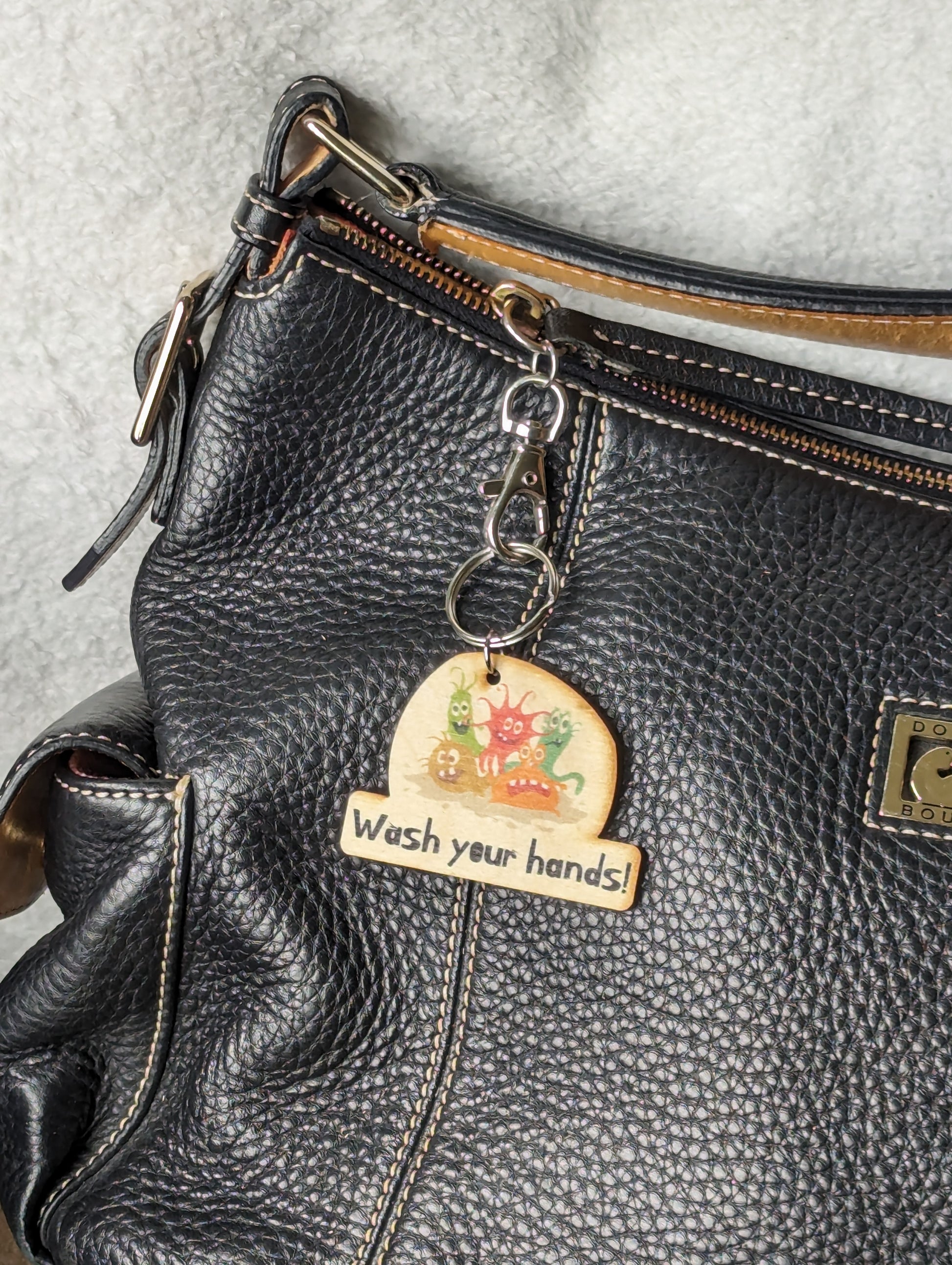 Originally designed only as a magnet, we decided this was something that needed to be mobile. The cute little germs make this a great backpack charm for your littles. No Elementary School bathroom should be without this!