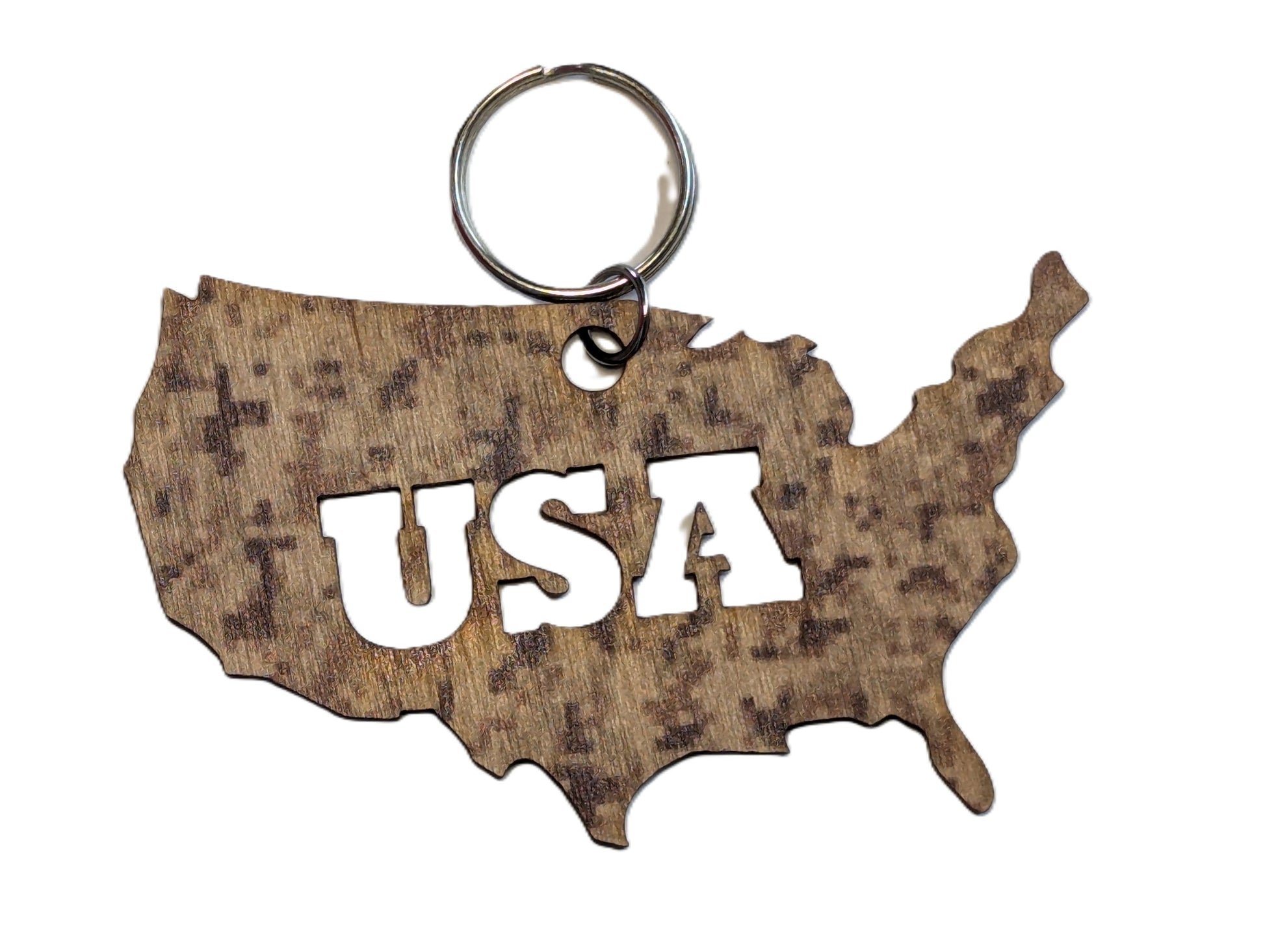 Desert Camo USA Shape Color Printed Gift Keychain Laser Cut Birchwood Large USA Made Support Our Troops